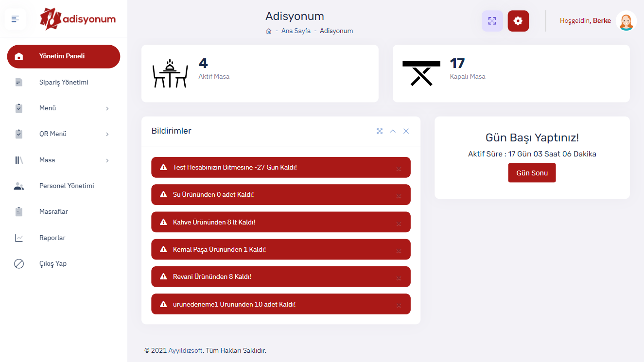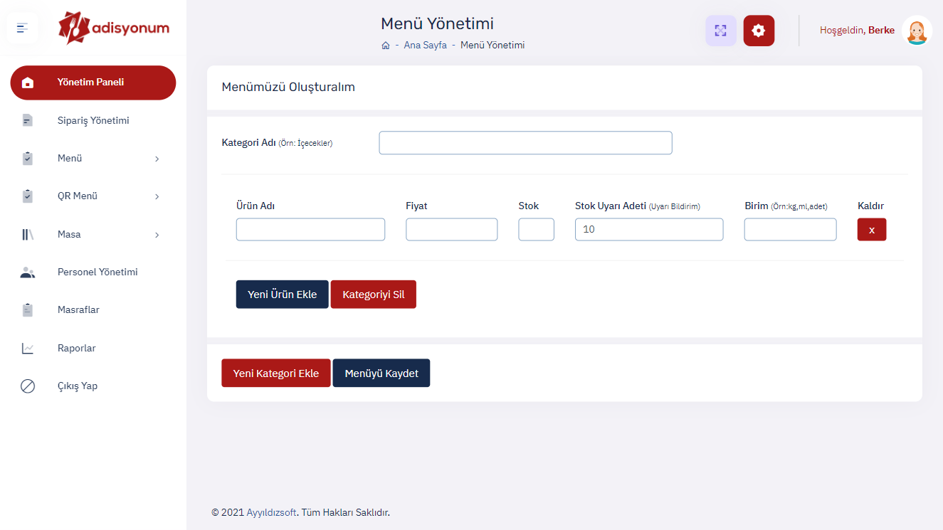 Restorant ve kafeler için menü, masa, personel, masraf, sipariş yönetimi yapılabilecek, anlık olarak sipariş yönetimi olan, menü stok takibi içeren özel web projesi.